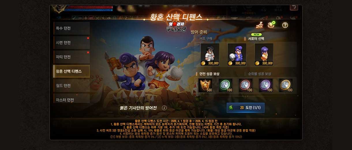 <div data-contents-type="text">2026년 4월 1일 (수) 정기점검 후 ~ 2026년 4월 15일 (수) 정기점검 전까지,</div><div data-contents-type="text">리니지M 시즌 던전 ‘황혼 산맥 디펜스’가 다시 찾아왔습니다!</div><div data-contents-type="text"><br class="ProseMirror-trailingBreak"></div><div data-contents-type="text">시즌4에서 새롭게 추가된 ‘서포터’ 시스템과 함께 던전을 플레이해보세요!</div><div data-contents-type="text"><br class="ProseMirror-trailingBreak"></div><hr data-page-break="true" contenteditable="false"><div data-contents-type="text"><br class="ProseMirror-trailingBreak"></div><div data-contents-type="text"><span style="color: var(--point11);"><strong>■ 황혼 산맥 디펜스 시즌 4 안내 (켄트/오렌 서버 제외)</strong></span></div><div data-contents-type="text"><span style="color: var(--point11);"><strong>1. 기간: 2026년 4월 1일 (수) 정기점검 후 ~ 2026년 4월 15일 (수) 정기점검 전</strong></span></div><div data-contents-type="text"></div><div data-contents-type="text"><span style="color: var(--point11);"><strong>2. 주요 개선 사항 안내</strong></span></div><div data-contents-type="text">- 신규 아군 2종이 추가됩니다.</div><div data-contents-type="text">- 신규 시스템인 서포터 기능이 추가되었습니다.</div><div data-contents-type="text"></div><div data-contents-type="text"><span style="color: var(--point11);"><strong>3. 서포트 시스템 안내</strong></span></div><div data-contents-type="text">- ‘열혈경파 쿠니오군’의 쿠니오, 리키, 하세베를 서포터로 구매할 수 있습니다.</div><div data-contents-type="text">- 구매한 서포터는 몬스터 이동 경로 내에 자동 소환됩니다.</div><div data-contents-type="text">- 서포터 보유량에 따라 용사의 증표 획득량이 증가합니다.</div><div data-contents-type="text">- 조합 정보 조회 버튼 좌측에 서포터 정보 조회 버튼을 터치하여 서포터 정보를 확인할 수 있습니다.</div><div data-contents-type="text">※ 구매하지 않은 서포터 정보는 확인할 수 없습니다.</div><div class="tableWrapper"><table class=""><colgroup><col><col><col><col></colgroup><tbody><tr><td style="padding: 4px 8px;"><div data-contents-type="text" style="text-align: center;"><strong>서포터</strong></div></td><td style="padding: 4px 8px;"><div data-contents-type="text" style="text-align: center;"><strong>스킬 명</strong></div></td><td style="padding: 4px 8px;"><div data-contents-type="text" style="text-align: center;"><strong>설명</strong></div></td><td style="padding: 4px 8px;"><div data-contents-type="text" style="text-align: center;"><strong>가격</strong></div></td></tr><tr><td style="padding: 4px 8px;"><div data-contents-type="text" style="text-align: center;">쿠니오</div></td><td style="padding: 4px 8px;"><div data-contents-type="text" style="text-align: center;">너트 슛</div></td><td style="padding: 4px 8px;"><div data-contents-type="text" style="text-align: center;">타겟 주변 2칸 광역 대미지</div><div data-contents-type="text" style="text-align: center;">아덴 용사의 증표 획득량 +5%</div></td><td style="padding: 4px 8px;"><div data-contents-type="text" style="text-align: center;">500,000 아데나</div></td></tr><tr><td style="padding: 4px 8px;"><div data-contents-type="text" style="text-align: center;">리키</div></td><td style="padding: 4px 8px;"><div data-contents-type="text" style="text-align: center;">어퍼 슛</div></td><td style="padding: 4px 8px;"><div data-contents-type="text" style="text-align: center;">단일 대상 석화</div><div data-contents-type="text" style="text-align: center;">아덴 용사의 증표 획득량 +5%</div></td><td style="padding: 4px 8px;"><div data-contents-type="text" style="text-align: center;">500,000 아데나</div></td></tr><tr><td style="padding: 4px 8px;"><div data-contents-type="text" style="text-align: center;">하세베</div></td><td style="padding: 4px 8px;"><div data-contents-type="text" style="text-align: center;">토네이도 슛</div></td><td style="padding: 4px 8px;"><div data-contents-type="text" style="text-align: center;">단일 대상 대미지</div><div data-contents-type="text" style="text-align: center;">아덴 용사의 증표 획득량 +5%</div></td><td style="padding: 4px 8px;"><div data-contents-type="text" style="text-align: center;">500,000 아데나</div></td></tr></tbody></table></div><div data-contents-type="text">※ 2종 보유 시 증표 획득량 5% 증가, 3종 보유 시 증표 획득량 15% 증가</div><div data-contents-type="text"></div><div data-contents-type="text"><span style="color: var(--point11);"><strong>4. 황혼산맥 디펜스 업적 리스트 안내</strong></span></div><div class="tableWrapper"><table class=""><colgroup><col><col><col><col></colgroup><tbody><tr><td style="padding: 4px 8px;"><div data-contents-type="text" style="text-align: center;"><strong>구분</strong></div></td><td style="padding: 4px 8px;"><div data-contents-type="text" style="text-align: center;"><strong>업적 명</strong></div></td><td style="padding: 4px 8px;"><div data-contents-type="text" style="text-align: center;"><strong>조건</strong></div></td><td style="padding: 4px 8px;"><div data-contents-type="text" style="text-align: center;"><strong>보상</strong></div></td></tr><tr><td style="padding: 4px 8px;"><div data-contents-type="text" style="text-align: center;">신규</div></td><td style="padding: 4px 8px;"><div data-contents-type="text" style="text-align: center;">보물 수집가 I</div></td><td style="padding: 4px 8px;"><div data-contents-type="text" style="text-align: center;">보물 ‘붉은색 복주머니’ 레벨 Max 달성</div></td><td style="padding: 4px 8px;"><div data-contents-type="text" style="text-align: center;">영웅 지배석 상자 (이벤트) 1개</div></td></tr><tr><td style="padding: 4px 8px;">
